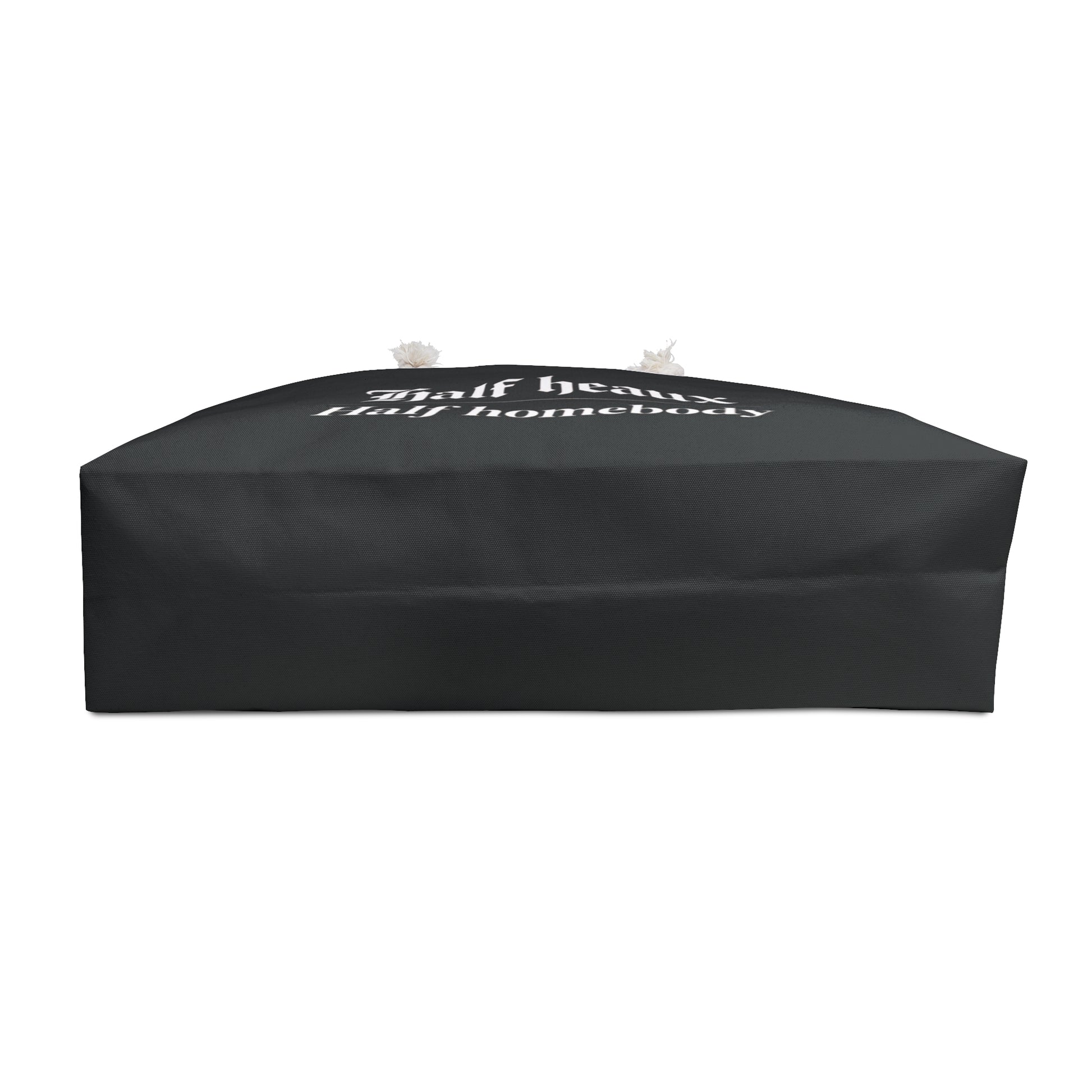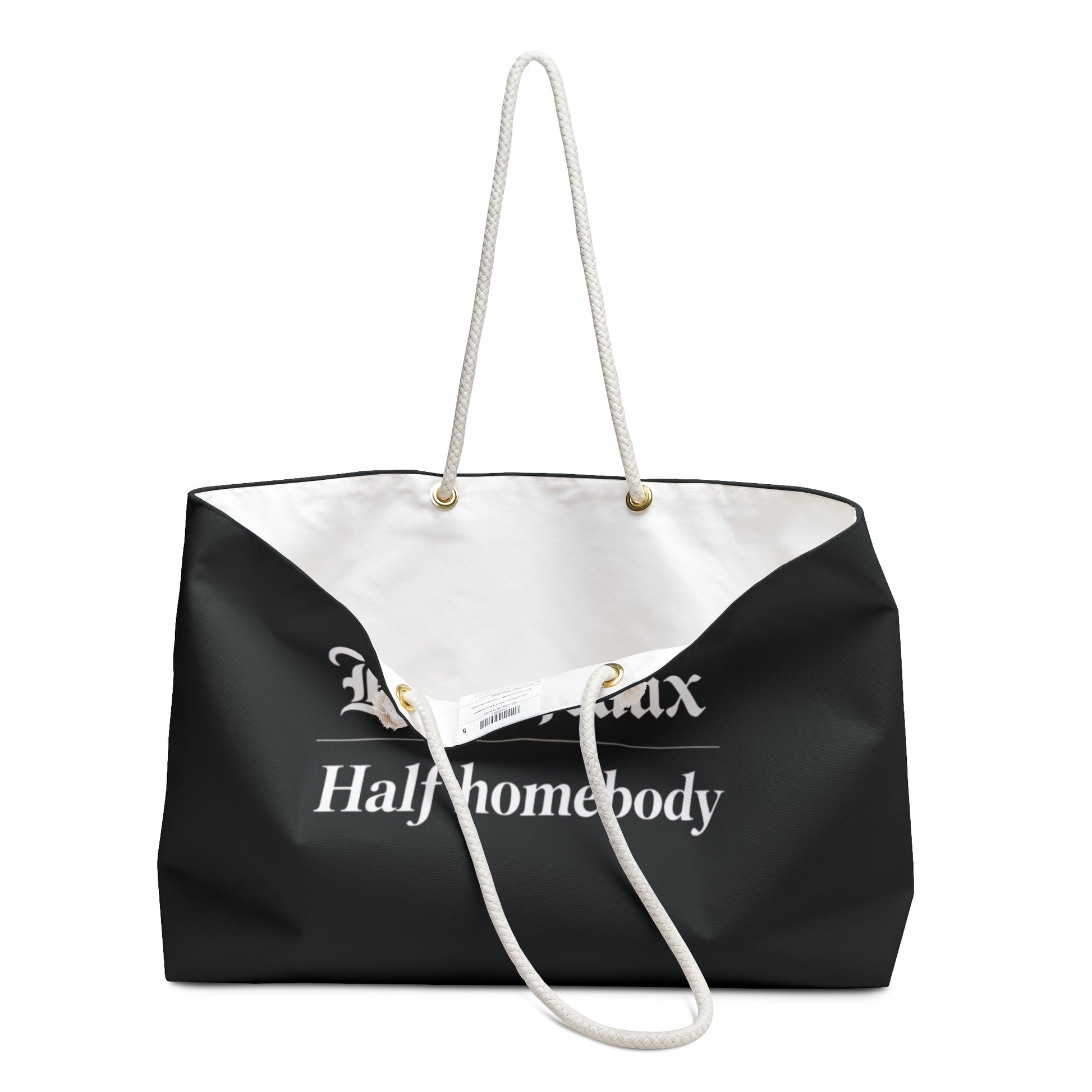 Roomy, relaxed, and a little bit sassy — this weekender bag carries the energy of a short escape and the comfort of a quiet night in. The matte black exterior holds a bold, vintage-script slogan that reads “Half heaux / Half homebody,” a wink for anyone who loves equal parts nightlife and Netflix. Thick cream rope handles sit through gold-tone grommets, giving a coastal, tactile feel when you sling it over your shoulder. Inside, a soft cream sheeting lining keeps contents protected and easy to find. Use it for a spontaneous road trip, a weekend at a friend’s place, or to haul workout gear and cozy essentials — it’s the kind of bag that matches your mood and moves with you.